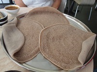 Injera, Enjera or Engera - is a very famous and traditional flatbread-like food made in Ethiopia, Eritrea and several other towns bordering both countries. This bread is a staple food in Eritrea, where it is served with almost every meal. Majority of the Injera is made with Teff flour, a gluten free flour produced from teff, a popular African grain.